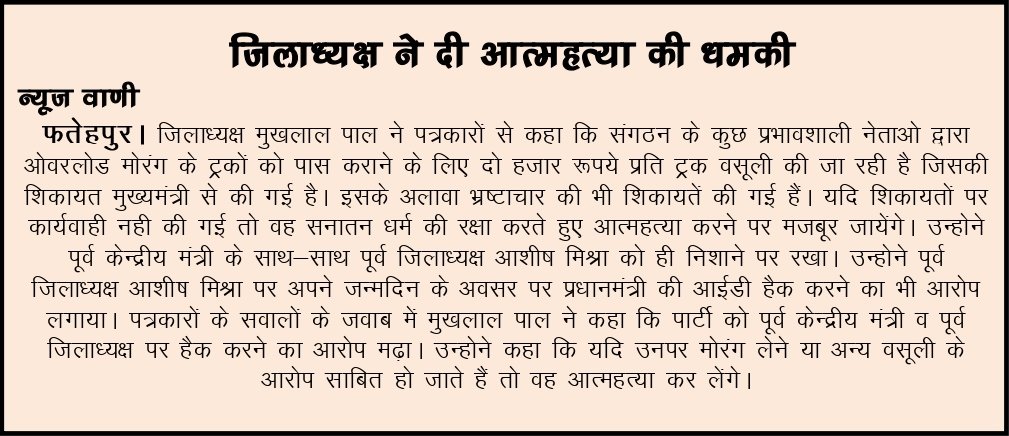फतेहपुर। भारतीय जनता पार्टी के वर्तमान जिलाध्यक्ष मुखलाल पाल पर बांदा जनपद के रहने वाले एवं युवा मोर्चा के प्रदेश पदाधिकारी रहे अजीत गुप्ता द्वारा आयोग में पद दिलाने के नाम पर 50 लाख रूपये की रिश्वत लिये जाने के आरोपों की जांच में दोषी पाये जाने पर जिलाध्यक्ष बौखला उठे हैं। आरोपों की पुष्टि होते ही शुक्रवार को आनन-फानन में बुलाई गई प्रेस कान्फ्रेस में उन्होने पार्टी में व्याप्त भ्रष्ष्टाचार की परतें खोलकर रख दीं। उन्होने संगठन, सरकार तथा जिले के प्रशासनिक अधिकारियों पर गंभीर आरोप लगाते हुए पूर्व केन्द्रीय मंत्री साध्वी निरंजन ज्योति पर भी भ्रष्टाचार के आरोप लगाये।