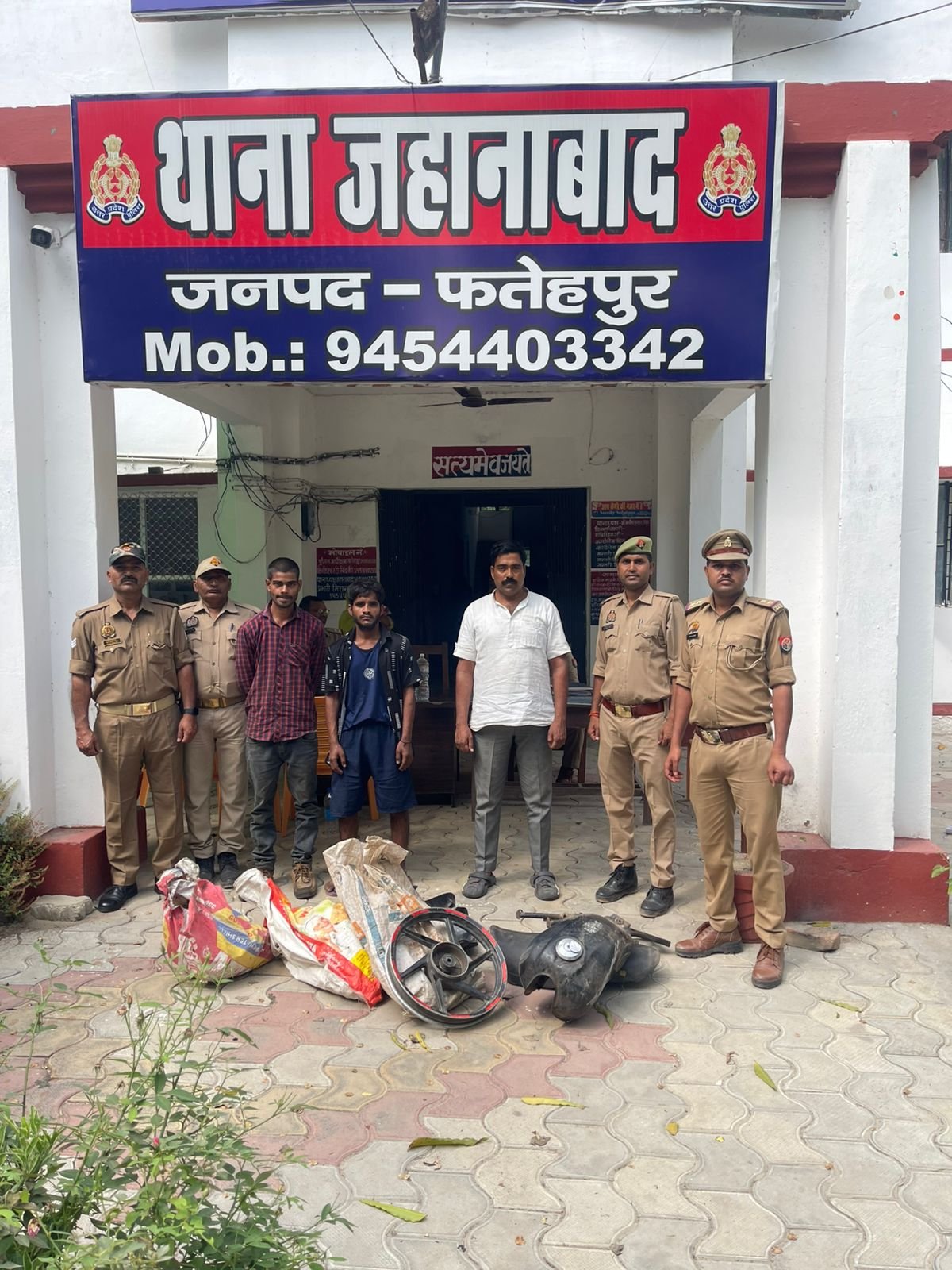 जहानाबाद: मुखबिर की सूचना पर पुलिस ने 24 घण्टों के भीतर ही बाइक चोरी का सफल अनावरण करते हुए दो बाइक चोरों एवं चोरी का सामान खरीदने वाले कबाड़ी सहित तीन को गिरफ्तार कर न्यायालय भेजा है थानाध्यक्ष मनीष कुमार सिंह को मुखबिर से सूचना मिली कि तीन लोग नहर कोठी खंडहर में बोरियों में कुछ भरे कहीं जाने की फिराक में बैठे हैं सूचना मिलते ही उपनिरीक्षक प्रवीण कुमार सिंह, विकास कन्नौजिया एवं नीरज कुमार पुलिस बल के साथ नहर कोठी खंडहर पहुंच गये जहां पर लूट, चोरी ,अवैध शराब एवं गैंगेस्टर के अपराधी अनुज कुमार उर्फ अन्नू विश्वकर्मा निवासी काजीटोला, एवं अरूण रस्तोगी हाल मुकाम कछेऊरा सहित कबाड़ी मोहम्मद हासिम निवासी काजी टोला को गिरफ्तार कर लिया, पुलिस ने पकड़े गये लोगों के पास से तीन अदद बोरियों में बाइक के कटे पार्ट्स बरामद किये हैं चोरों ने अपना जुर्म कबूल करते हुए बताया कि बीते 23,24 मार्च की मध्य रात्रि को कस्बे के अमौली चौराहे से शराब की दुकान के सेल्समैन प्रदीप कुमार उर्फ कप्तान की बाइक हम लोगों ने चुराई थी जिसके पार्ट्स हासिम कबाड़ी को बेचना थे उपरोक्त बाइक चोरी का मुकदमा भुक्तभोगी द्वारा थाना हाजा में 26 मार्च को दर्ज कराया गया था पुलिस ने कबाड़ी सहित तीनों को बाइक चोरी का खुलासा करते हुए न्यायालय भेजा है