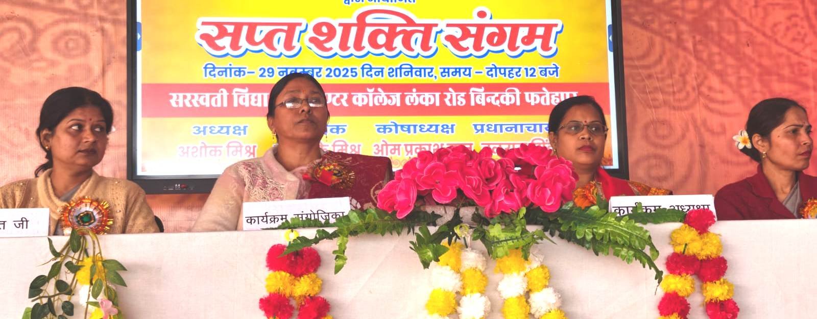 बिंदकी, फतेहपुर।      बिंदकी नगर के मोहल्ला लंका रोड स्थित एक इंटर कॉलेज में शनिवार को दिन में करीब 1 से सप्तशक्ति संगम कार्यक्रम का आयोजन किया गया। जिसमें मौजूद वक्ताओंने अच्छे संस्कार तथा व्यवहार पर बल दिया। इस मौके पर वक्त शक्ति वाजपेई ने कहा कि अच्छा शिष्टाचार व्यक्ति को ऊंचाइयों तक पहुंचना है हमें अपने बड़ों का आदर करना चाहिए तभी हमें जीवन में सफलता मिलेगी। इस मौके पर वक्त प्रियंका मिश्रा ने कहा कि हमें अच्छा भोजन करना चाहिए जिससे तन मन शुद्ध रहता है उन्होंने सात्विक भोजन पर बल दिया। उन्होंने कहा कि हम सभी को भजन पूरे परिवार के साथ करना चाहिए क्योंकि उसे समय एक दूसरे से बात हो सकती है और भावनात्मक एकता बनी रहती है। इस मौके पर कार्यक्रम की अध्यक्षता कर रही समाजसेवी स्वाती ओमर ने कहा कि समय-समय पर पूरे परिवार को बच्चों के सहित भ्रमण करना चाहिए इससे ज्ञान बढ़ता है आनंद के साथ ऐतिहासिक वस्तुओं का ज्ञान बढ़ता है जिससे आने वाले समय में सफलता मिलती है। उन्होंने कहा कि छोटे बच्चों को कम से कम मोबाइल का प्रयोग करना चाहिए और अधिक से अधिक पढ़ाई में ध्यान देना चाहिए इस मौके पर कार्यक्रम का संचालन दीपिका देवी ने किया तथा कार्यक्रम की संयोजिका अलखनंदा पांडे रही। कार्यक्रम में विभिन्न वीरांगनाओं की झांकी भी प्रस्तुत की गई। इस मौके पर प्रधानाचार्य बलराम सिंह के अलावा शिक्षक प्रशांत किशोर सहित तमाम लोग मौजूद रहे।