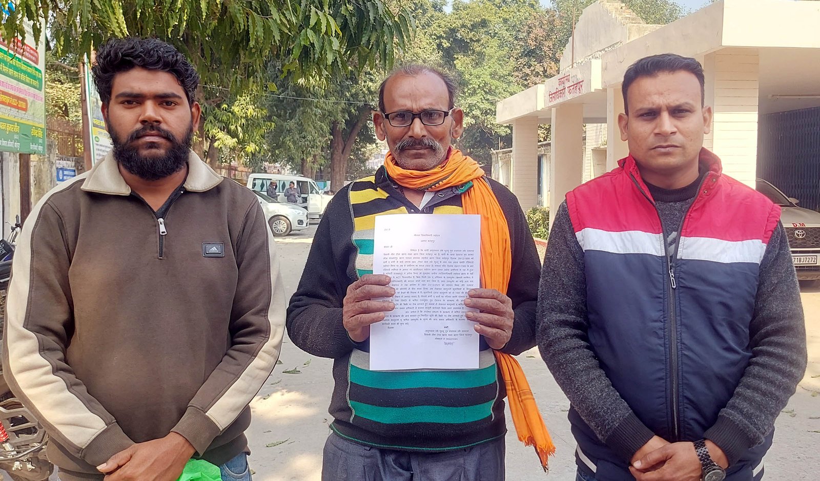 – डीएम को शिकायती पत्र देने जाता पीड़ित परिवार।