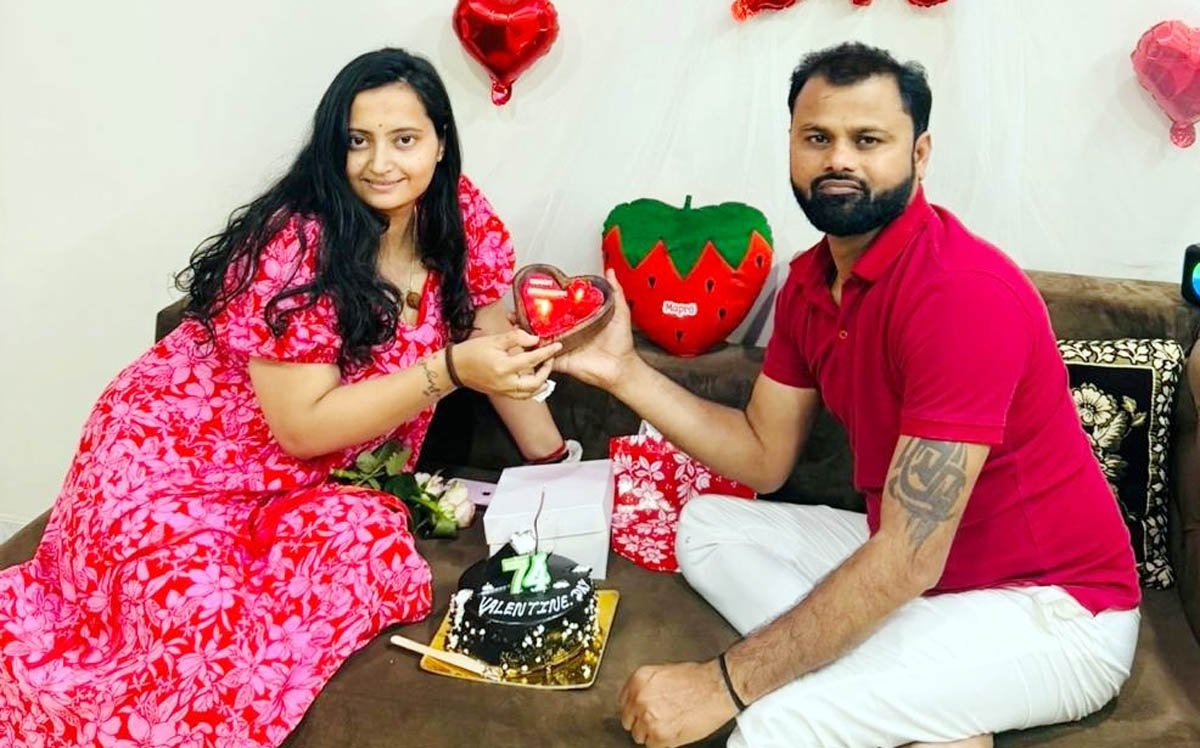 – केक काटकर वैलेंटाइन डे मनाता दम्पति।